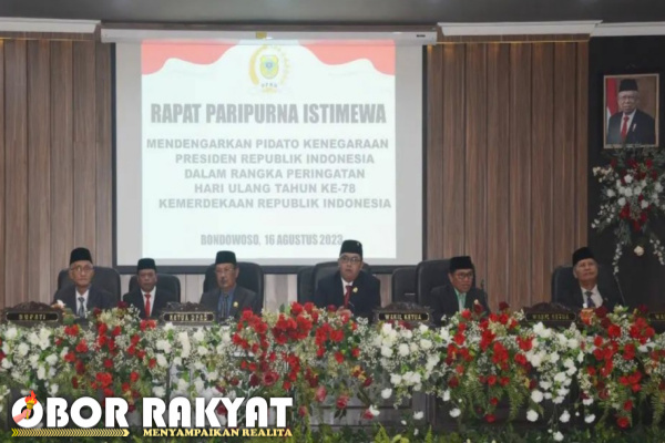 Bondowoso, Obor Rakyat – Eksekutif dan Legislatif Kabupaten Bondowoso menggelar rapat paripurna istimewa dengan agenda mendengarkan pidato kenegaraan Presiden RI, Joko Widodo (Jokowi) dalam memperingati HUT ke-78 kemerdekaan Republik Indonesia pada sidang tahunan MPR-RI, DPD RI, dan DPR RI, Rabu (16/8/2023).