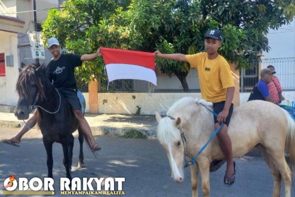 Situbondo, Obor Rakyat – Tiga santri Pondok Pesantren (PP) Wali Songo Mimbaan, mempunyai cara unik untuk peringati Hari Ulang Tahun (HUT) kemerdekaan Republik Indonesia ke-78, dengan mengibarkan bendera menunggangi kuda di sepanjang Jalan Pantura Situbondo, Kamis (17/08/2023).