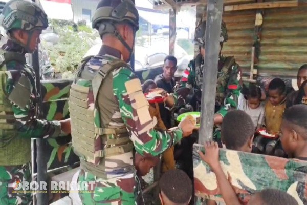 Yahukimo, Obor Rakyat – Suasana penuh kehangatan dan kekeluargaan tampak di Pos Kurima Satgas Yonif 521/DY ketika para personel menggelar kegiatan makan bergizi bersama anak-anak Papua di Distrik Kurima, Kabupaten Yahukimo, Minggu (2/10/2025).