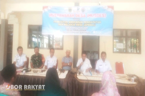 Bondowoso, Obor Rakyat – Pemerintah Desa (Pemdes) Kabuaran, Kecamatan Grujugan, Kabupaten Bondowoso, menggelar Musyawarah Desa (Musdes) dalam rangka penetapan perubahan Anggaran Pendapatan dan Belanja Desa (APBDes) Tahun Anggaran 2025 sekaligus penetapan Rencana Kerja Pemerintah Desa (RKPDes) Tahun 2026.