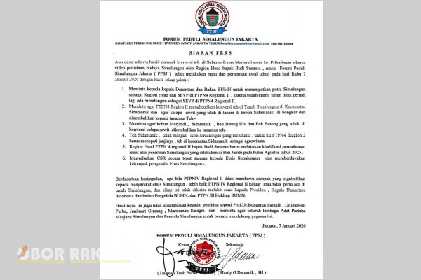Selain itu, FPSJ juga mendesak Danantara dan BUMN agar memberikan kesempatan lebih besar kepada putra daerah Simalungun untuk menduduki jabatan strategis di PTPN IV, khususnya sebagai Regional Head dan Senior Executive Vice President (SEVP).