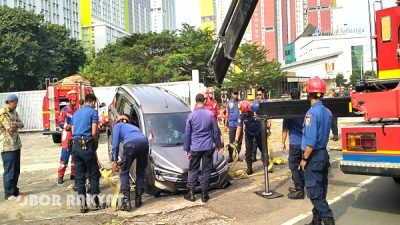 Mobil GoCar Terperosok ke Selokan di Kemayoran, Evakuasi Libatkan Crane Damkar